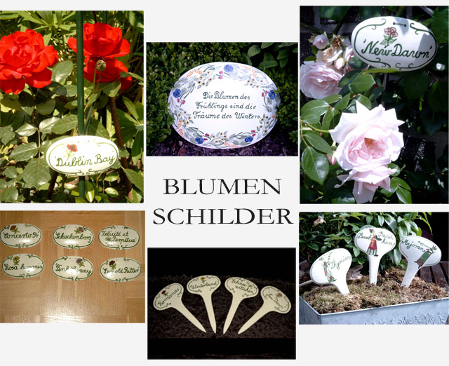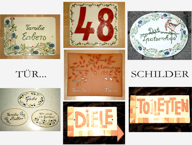 Schilder aller Art (Türschilder, Hausnummern, Wegweiser, Rosen- und Kräuterschilder etc.) fertige ich für Ihre speziellen Zwecke und nach Ihren Gestaltungsvorstellungen (Größe, Motiv, Farbe und Form). Eine kleine Auswahl zeigen die Bilder.